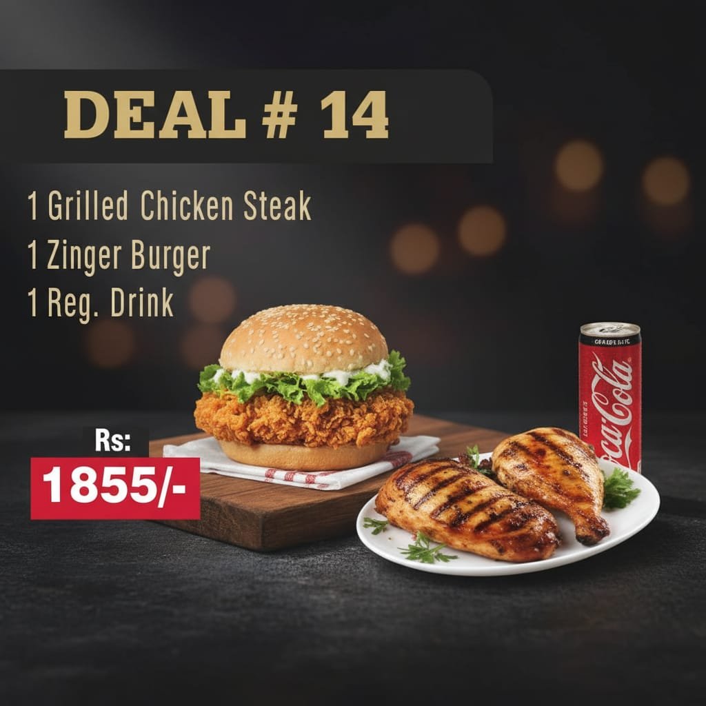 If you’re looking for a complete, satisfying, and flavorsome meal, this fast-food deal is crafted just for you! Priced at an affordable Rs.1855, it offers you a premium combination of a succulent grilled chicken steak, a crispy zinger burger, and a refreshing regular drink to complete the experience. This deal is perfect for anyone who seeks convenience without compromising on taste or quality.